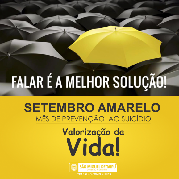 Falar é a melhor solução! Setembro Amarelo é uma campanha de conscientização sobre a prevenção do suicídio, com o objetivo direto de alertar a população a respeito da realidade do suicídio no Brasil e no mundo e suas formas de prevenção. Assim a Prefeitura Municipal de São Miguel de Taipu abraça esta causa e altera as cores em suas páginas para a cor amarela. Além da alteração das cores, a Prefeitura, através da Secretaria Municipal de Saúde traz para a comunidade um trabalho de acolhimento e esclarecimento para que haja o alerta da comunidade com relação ao assunto.O suicídio tem sido um mal silencioso, pois as pessoas fogem do assunto e, por medo ou desconhecimento, não veem os sinais de que uma pessoa próxima está com ideias suicidas. Por dia, 32 brasileiros cometem suicídio, o que representa um índice superior às vítimas da AIDS e de muitos tipos de câncer.